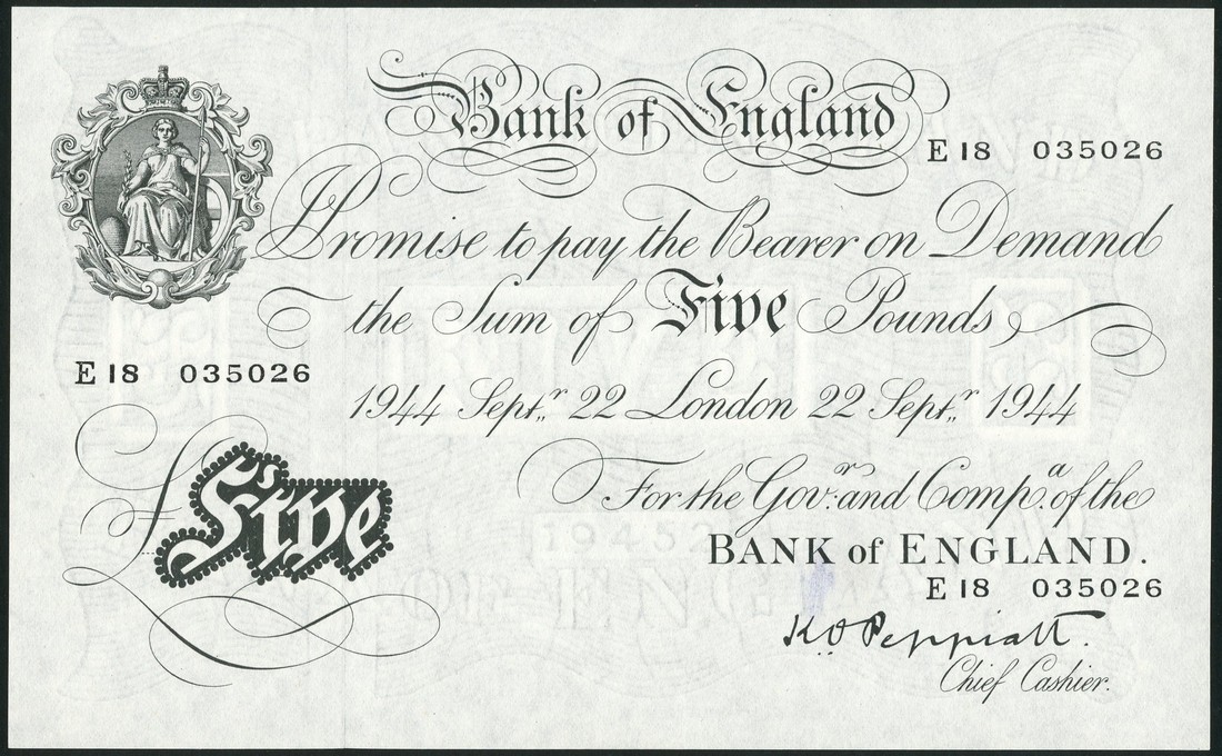 Bank of England, K.O.Peppiatt, £5, London, 22 September 1944, serial number E18 035026, black and white, ornate crowned head of Britannia top left, value in black tablet low left