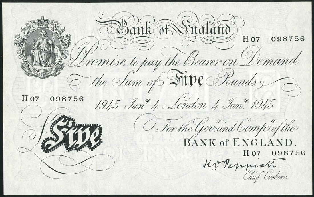 Bank of England, K.O.Peppiatt, £5 , London, 4 January 1945, serial number H 07 098756, black and white, ornate crowned vignette of Britannia top left, value in black tablet low left