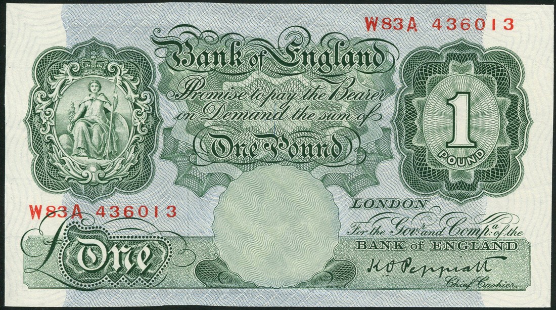 (x) Bank of England, K.O.Peppiatt, 10/- (2), 1948, prefix 25J, and £1 (4), 1948, prefix W83A, red and green respectively, Britannia at top left