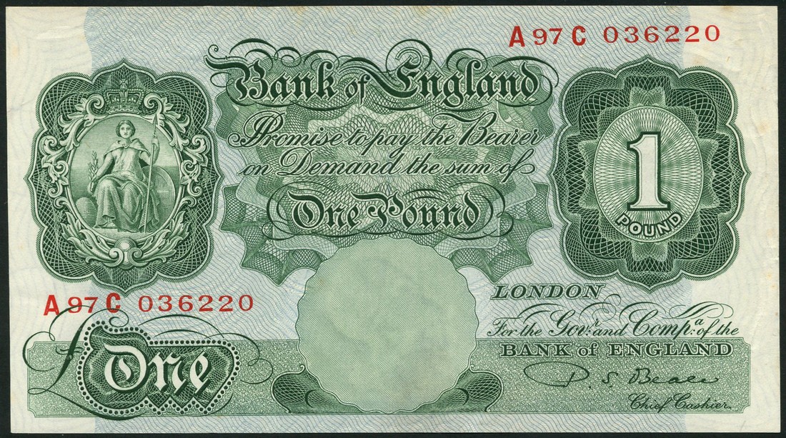 Bank of England, P.S. Beale, £1 (18), ND (1950), consecutive serial numbers A97C 036220-37, green and pale blue, Britannia at left, reverse green, blue and pink
