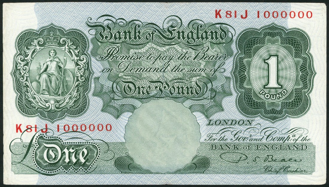 (x) Bank of England, P. S. Beale, £1, 1950, serial number K81J 1000000, green, ornate vignettte of Britannia, value in ornate tablet at low left and at right, reverse green, pink and blue