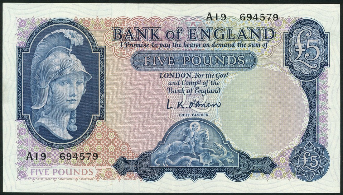 Bank of England, L.K.O'Brien, £5 (3), prefixes A04,A19,H38, blue and multicoloured, lion and key design, also Hollom £5 (2), A47,L57, J.S.Fforde £5 (3), W36,62A,25C and Page £5, 46D