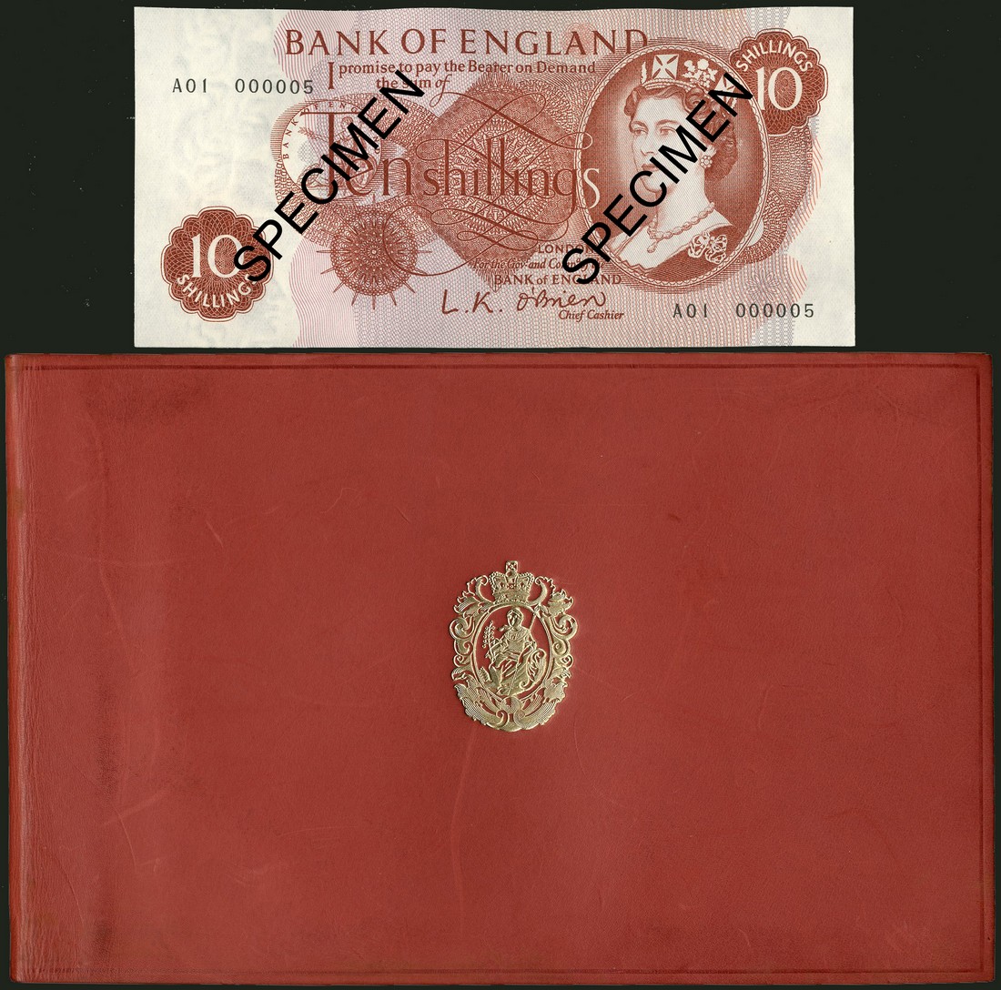 Bank of England, L.K.O'Brien, 10/-, ND (1961), serial number A01 000005, red, Elizabeth II at right, Britannia at centre left, value in text at centre and at low left and top right, reverse Britannia at centre, complete with red leather presentation folder with gold Britannia on cover, text inside reads 'BANK OF ENGLAND OCTOBER 1961'