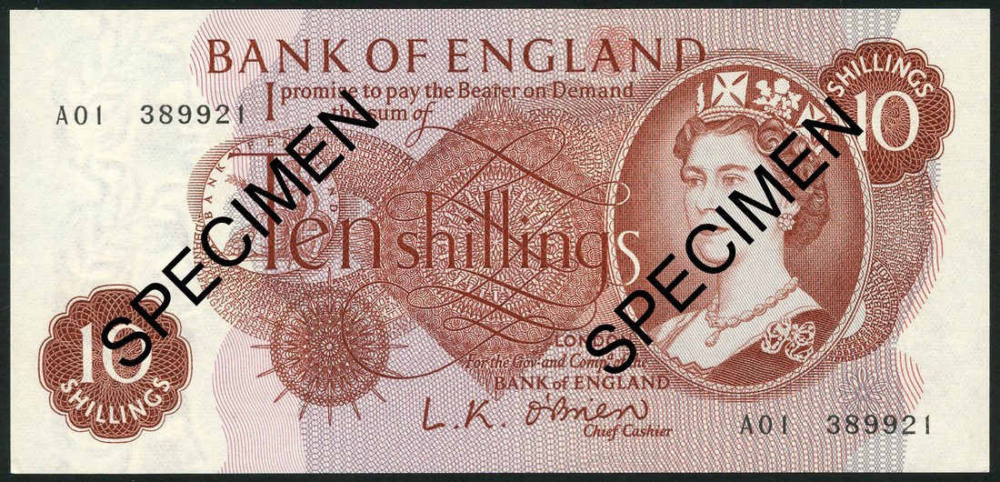 Bank of England, L. K. O'Brien, 10 shillings, ND (1961), serial number A01 389921, red brown, Queen Elizabeth II at right, reverse Britannia, a lovely example