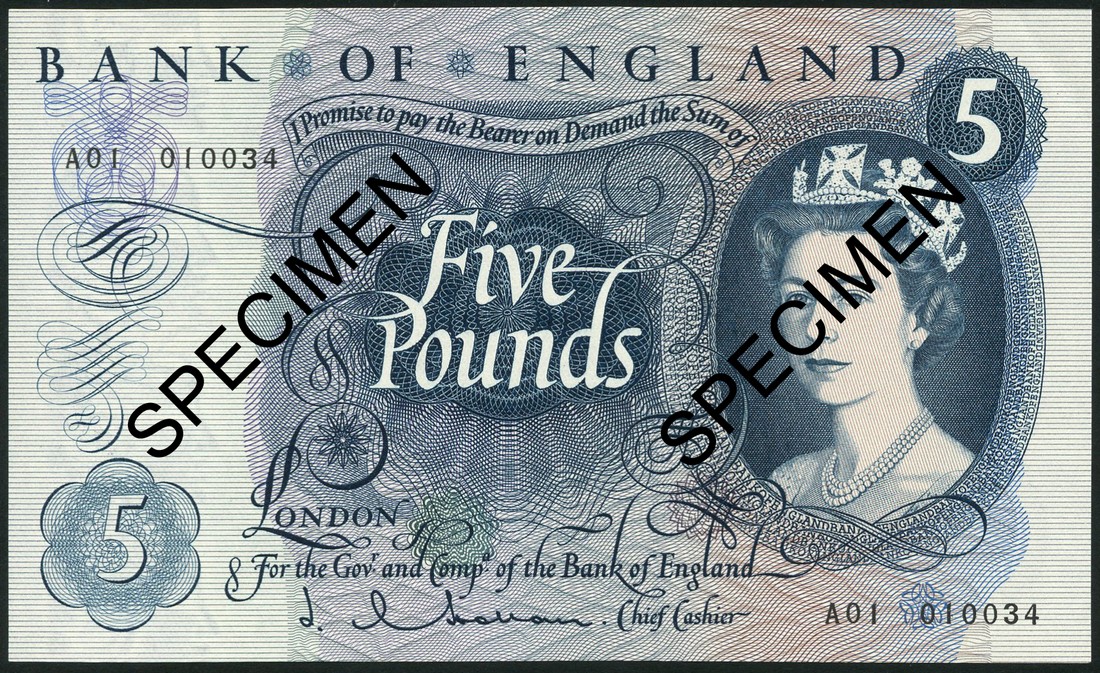 Bank of England, J. Q. Hollom, £5, serial number A01 010034, blue and multicolour, Queen Elizabeth II at right, reverse Britannia