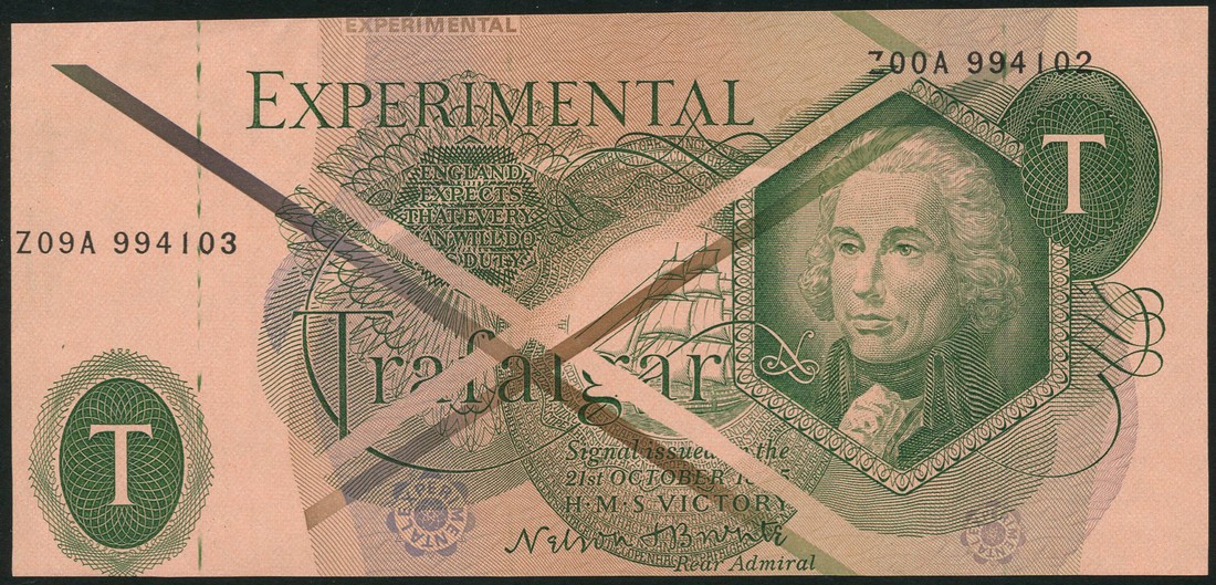 Bank of England, an experimental design for a proposed issue (£1?), ND (ca 1963), serial number Z00A 994102, green and pink and lilac, Nelson at right in hexagonal frame, ship of the line (probably the Victory), printed signature of Nelson Bronte low centre, T in value oval low left and top right, EXPERIMENTAL in text low left, reverse pink and green, owl at centre, EXPERIMENTAL in text below