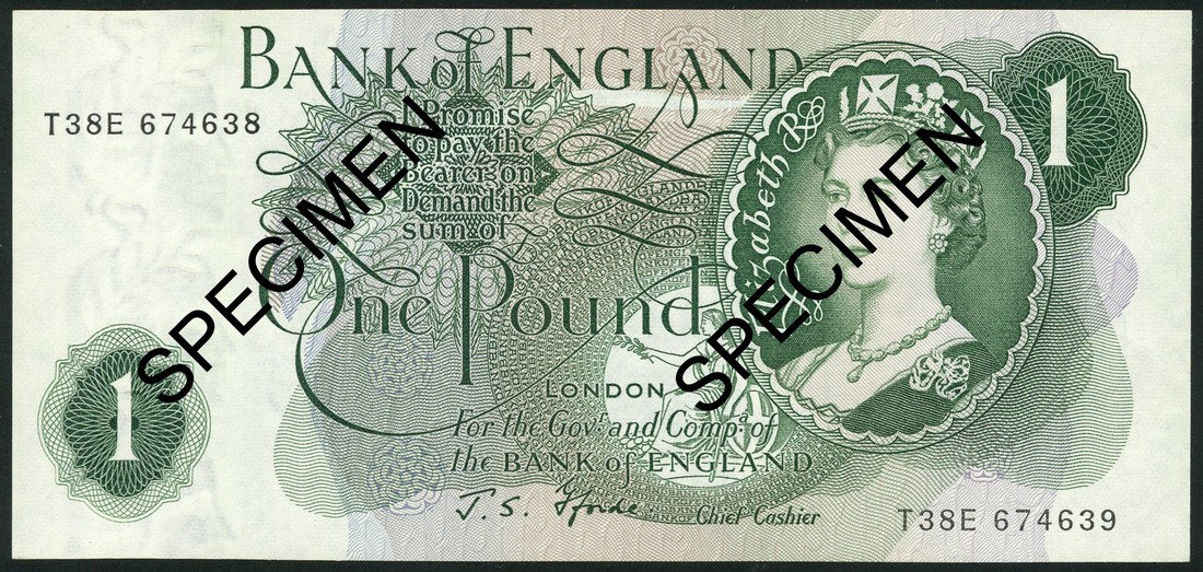 Bank of England, J. S. Fforde, £1, ND (1967), serial numbers T38E 674638 top left and T38E 674639 low right, green, Queen Elizabeth II at right, reverse Britannia