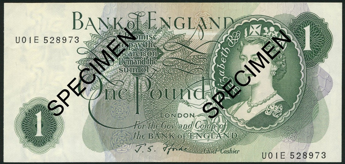 Bank of England, J.S Fforde, £1 (2), ND (1967), serial numbers U01E 528972/973, green and white, Elizabeth II at right, small G on reverse, also £1, serial prefix R72L