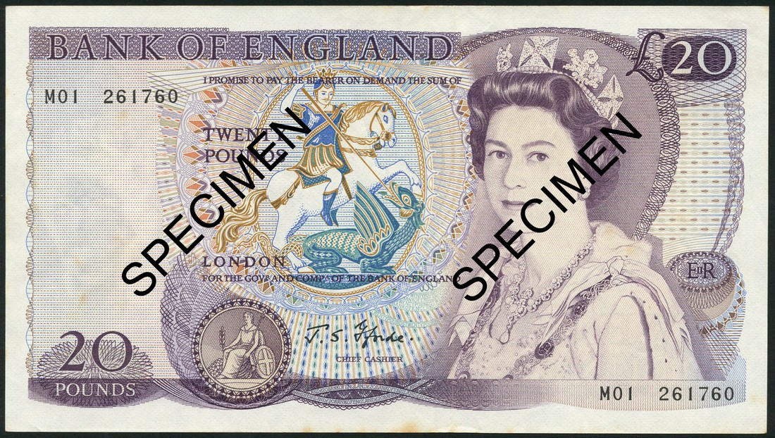 Bank of England, J. S. Fforde, £20, serial number MO1 261760, purple on multicolour, Queen Elizabeth II at right, Saint George slaying dragon at centre, reverse William Shakespeare