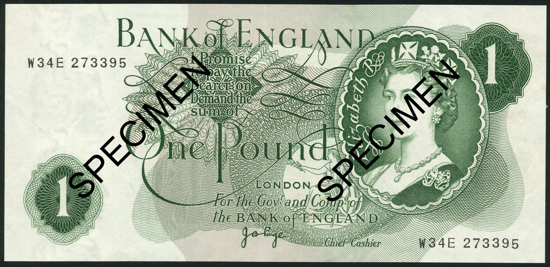 Bank of England, J. B. Page, £1, ND (1970), serial number W34E 273395, green, Queen Elizabeth II at right, reverse Britannia, missing colours and rosettes from the underprint on obverse
