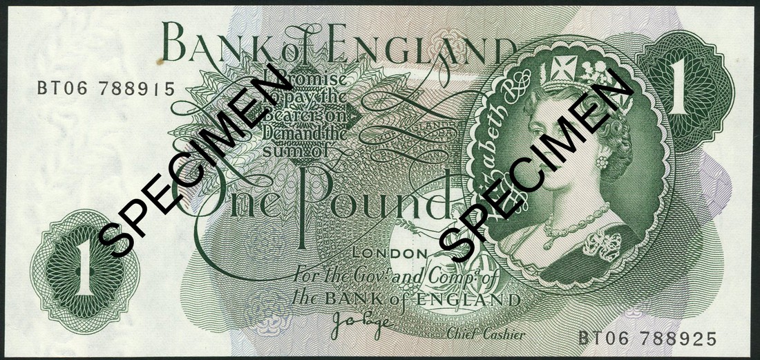 Bank of England, J. B. Page, a group of five £1, ND (1970), all with mismatching serial numbers, green, Queen Elizabeth II at right, reverse Britannia