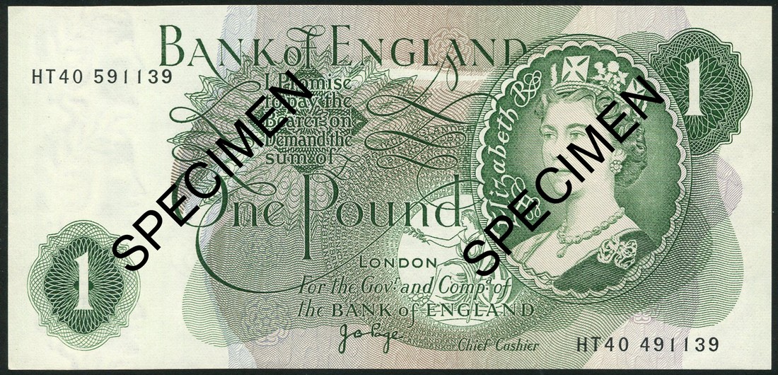 Bank of England, J. B. Page, £1, ND (1970), unmatching serial number HT40 591139 at top left, HT40 491139 low right, green, Queen Elizabeth II at right, reverse Britannia