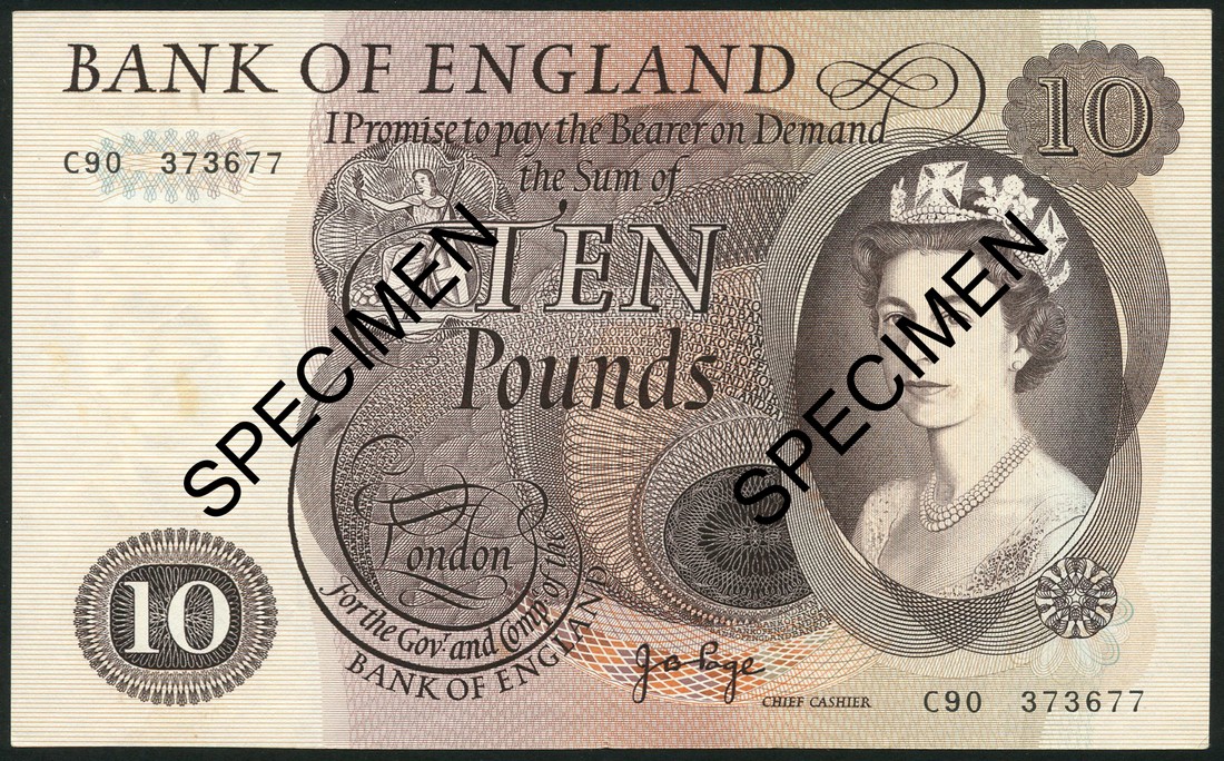 Bank of England, J. B. Page, £10, serial number C90 373677, brown on multicolour underprint, Queen Elizabeth II at right, Britanna left centre, reverse lion at centre,