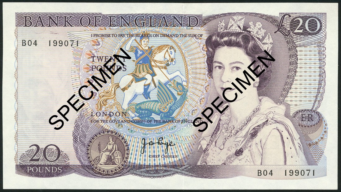 Bank of England, J. B. Page, £20, serial number B04 199071, purple on multicolour underprint, Queen Elizabeth II at right, Saint George slaying dragon top centre, reverse William Shakespeare