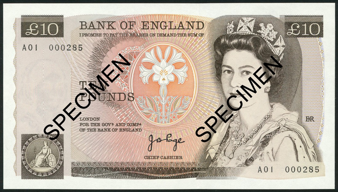 Bank of England, J .B. Page, £10, serial number A01 000285, brown on multicolour, Queen Elizabeth II at right, reverse Florence Nightingale