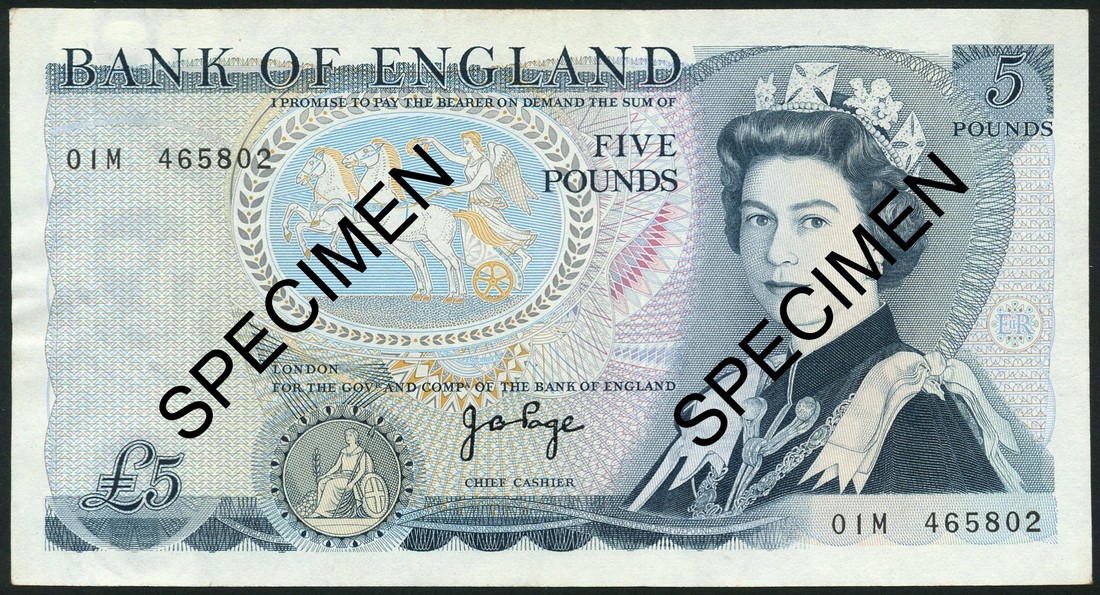 Bank of England, J. B. Page, £5, serial number 01M 465802, blue on multicolour, Queen Elizabeth II at right, Victory in chariot top centre, reverse Duke of Wellington