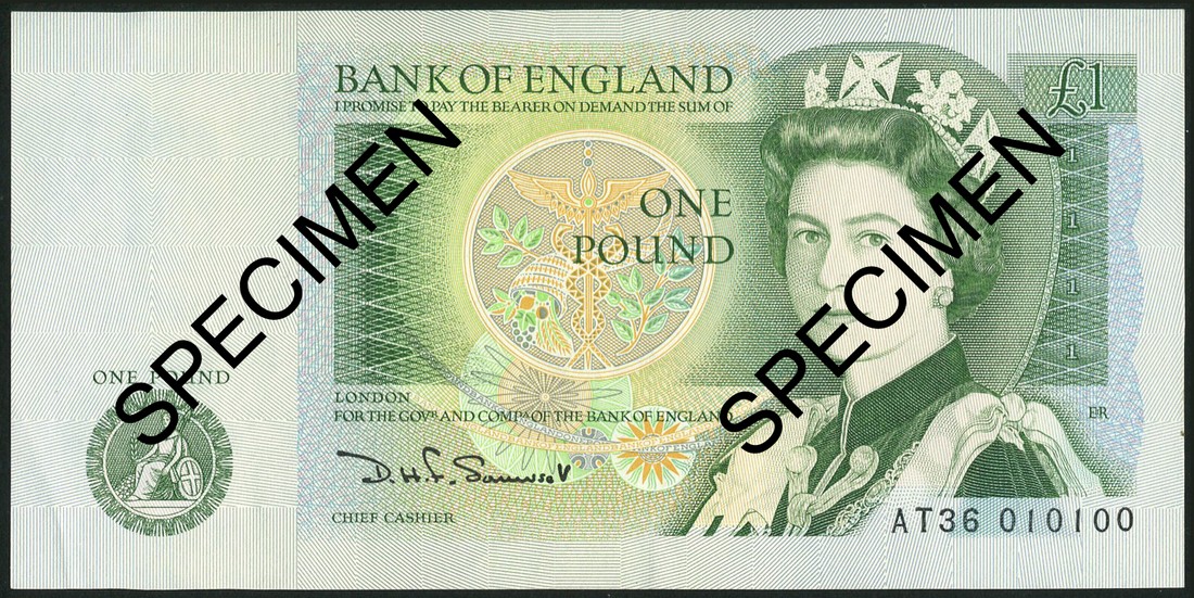 Bank of England, D. H. F. Somerset, £1 (5), ND (1981), serial numbers T36 010100, BR41 001001, BR42 001001, BR42 001010 and BR41 001011, green on multicolour, Queen Elizabeth II at right, reverse Sir Isaac Newton