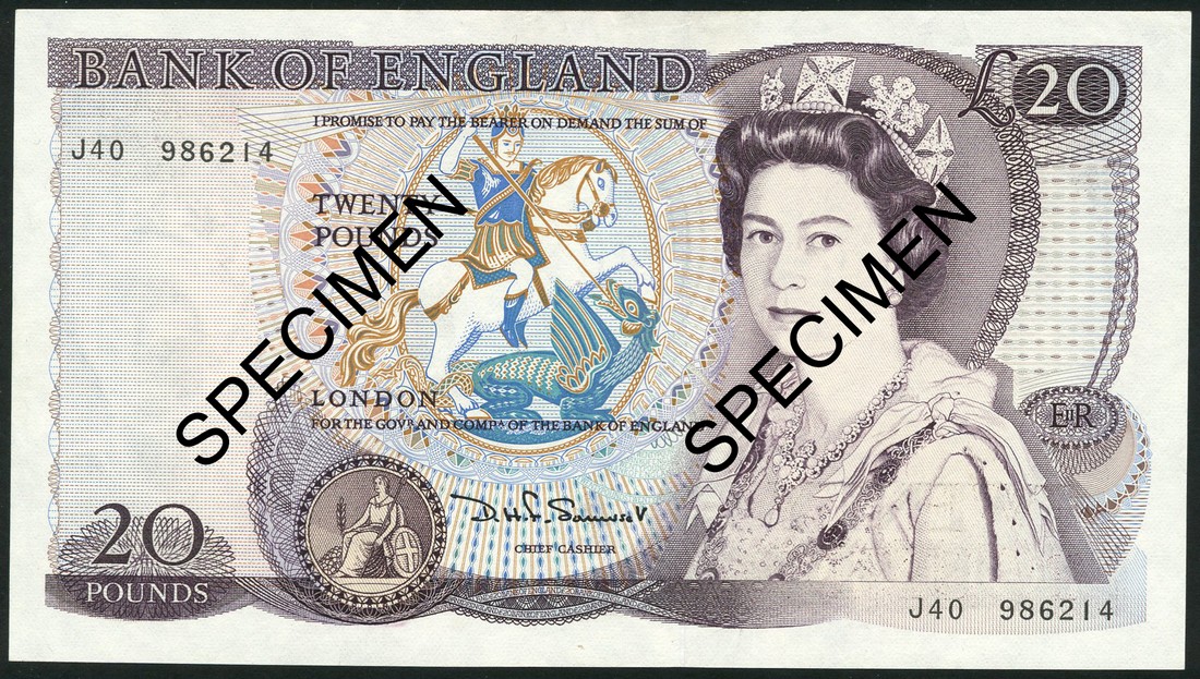 Bank of England, D. H. F. Somerset, £20, serial number J40 986214, purple and multicloured, Queen Elizabeth II at right, Saint George amd dragon top centre, reverse William Shakespeare at right, Romeo and Juliet play at top right centre
