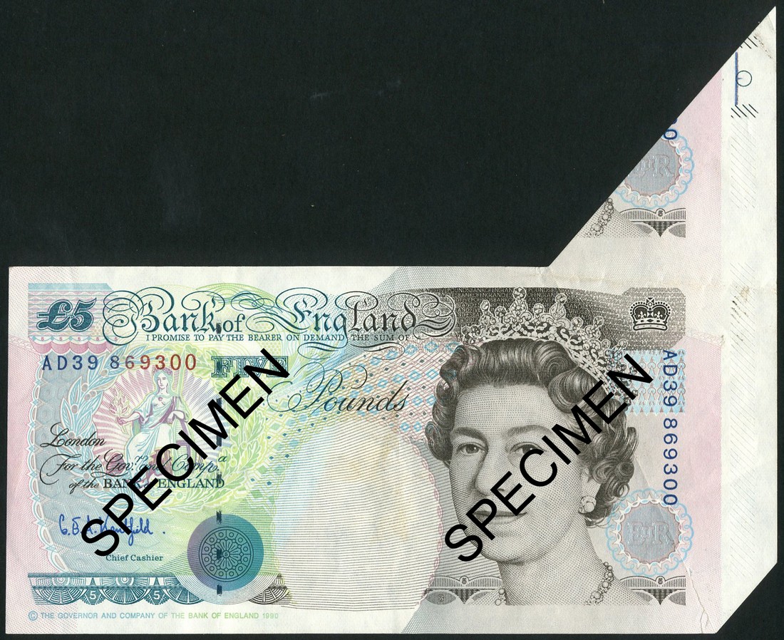 Bank of England, G. E. A. Kentfield, £5, serial number AD39 869300, multicolour, Queen Elizabeth II at right, Britannia at left, reverse George Stephenson at right, Stephenson's rocket at left, large flap of extra paper top right and down right margin, missing bottom right corner