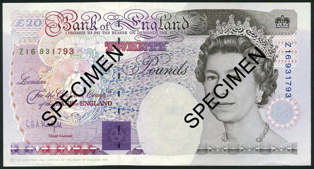 Bank of England, G. E. A. Kentfield, £20, ND, serial number Z16 931793, purple and multicoloured, Queen Elizabeth II a right, Britannia at left,