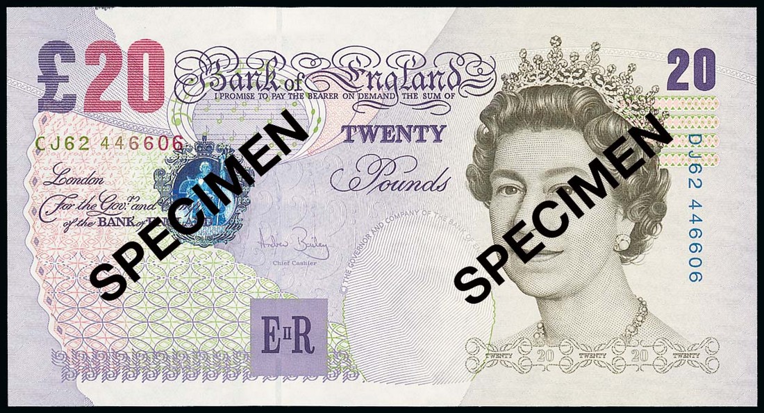 Bank of England, A. J. Bailey, £20, ND (2004), serial number CJ62 446606/DJ62 446606, multicolour, Queen Elizabeth II at right, reverse Elgar, mismatched serial numbers
