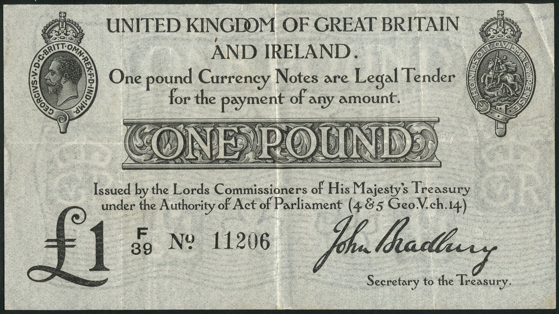 A group of Bank of England and Treasury notes, including, John Bradbury, 10/- and £1, second issue, (T11, T13), Peppiatt, 10/- (2), purple, and £1 (2) blue, £5, 16 October 1944 (B249, B251, B255),