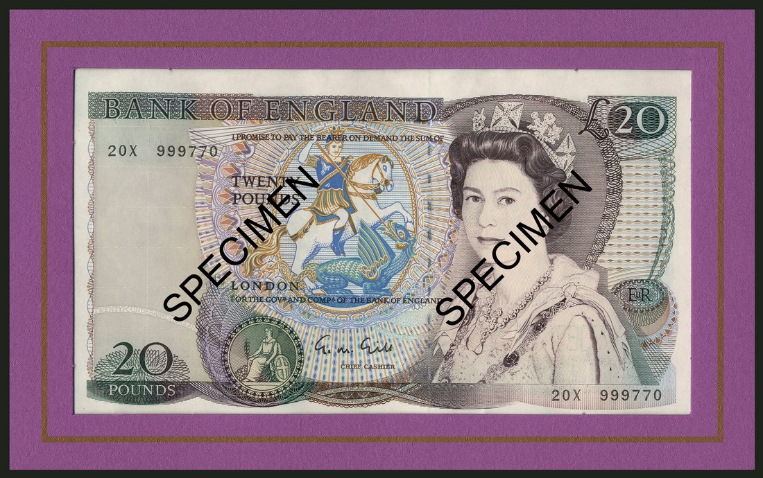 Debden presentation pack, brown album with Britannia in gold at centre containing Gill £20, series D, serial number 20X 999770 and Gill £20, series E, serial number A01 999770