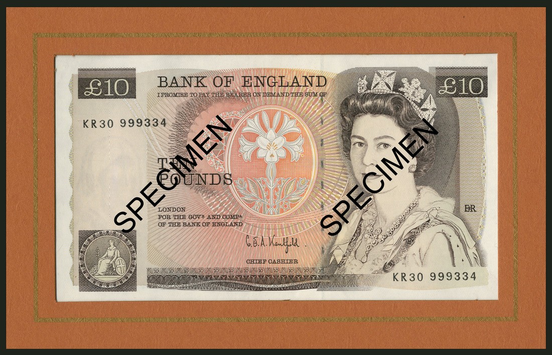 Debden presentation pack, brown album with Britannia in gold at centre, containing Kentfield £10, series D, serial number KR30 999334 and Kentfield, series E, serial number A01 999334