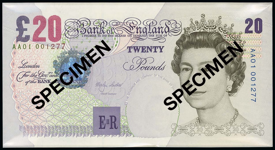 Debden presentation pack, folder containing Lowther £5, serial number HA01 001277, reverse Elizabeth Fry, £10, serial number AA01 001277, reverse Charles Darwin, £20, serial number AA01 001277, reverse Sir Edward Elgar