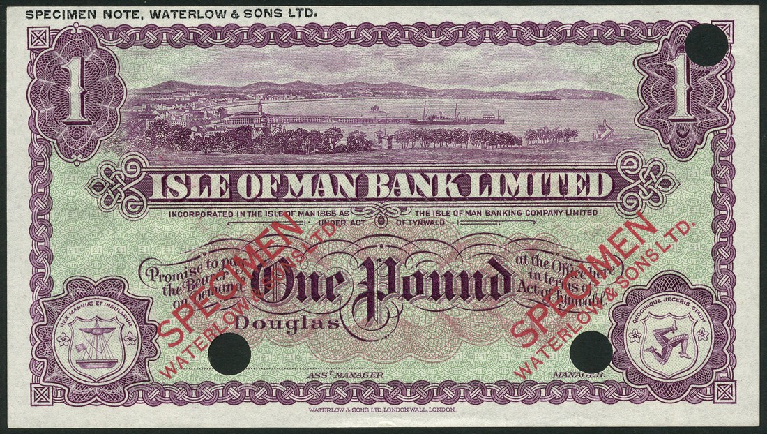 Isle of Man Bank Limited, colour trial £1, Douglas, ND (type of 1934), no serial numbers, lilac and green, view of Douglas harbour top centre, arms low left, triskeles low right, no signatures, reverse lilac and green, triskeles at centre, value at left and right