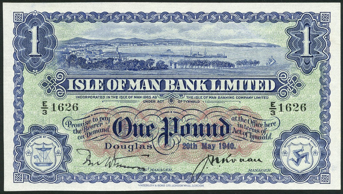 Isle of Man Bank Limited, £1, Douglas, 20 May 1940, serial number E/3 1626, blue and pale green and lilac, view of Douglas harbour top centre, arms low left, triskeles low right, manuscript signatures of Ronan and Watterston, reverse blue-green, triskeles at centre, value at left and right