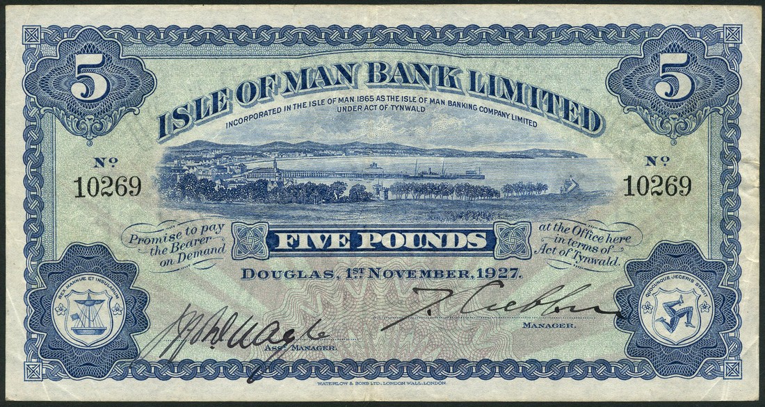 Isle of Man Bank Limited, £5, 1 November 1927, serial number 10269, blue, lilac and green, view of Douglas harbour at top centre, arms low left, triskeles low right, two manuscript signatures of Quayle and Cubbon