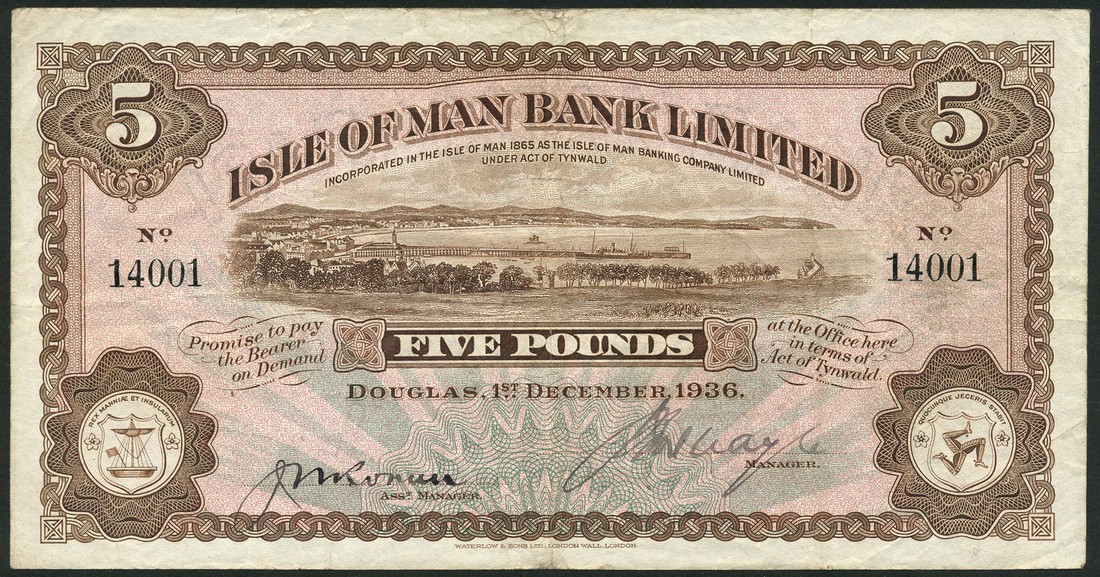 Isle of Man Bank Limited, £5, Douglas, 1 December 1936, serial number 14001, brown and pink and pale blue-green, view of Douglas harbour top centre, arms low left, triskeles low right, manuscript signatures of Ronan and Quayle, reverse brown and pink, triskeles at centre, value at left and right