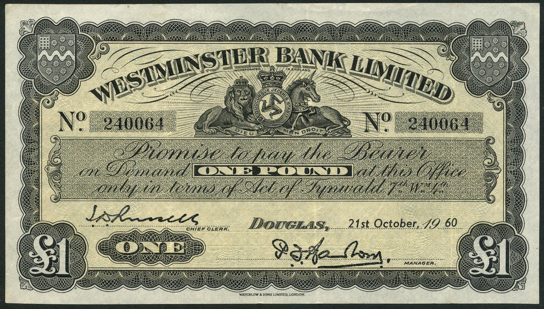 Westminster Bank Limited, £1, Douglas, 21st October 1960, serial number 240064, black and pale yellow, arms top centre, two printed signatures of Barlow and Russell, reverse blue and pale green, triskeles at centre, value at left and right