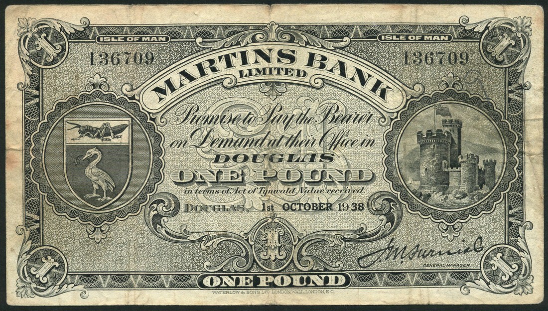 Martins Bank Limited, £1, Douglas, 1 October 1938, serial number 136709, black and grey, the Tower of Refuge at right, arms at left, signature of Furniss, reverse grey, triskeles at centre, Castle Rushen at left, the Albert Tower at right