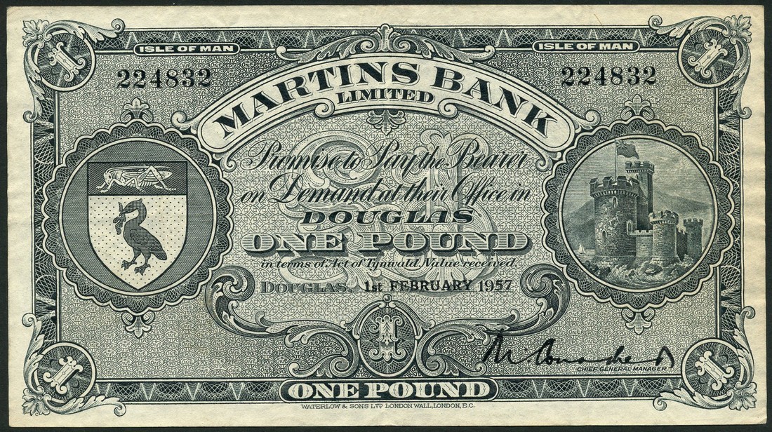 Martin's Bank Limited, Isle of Man, £1, 1 February 1957, serial number 224832, dark grey, bank's coat of arms at left, Tower of Refuge at right, reverse Isle of Man Triune at centre, Castle Rushen and Albert Tower at left and right respectively, Conacher signature low right