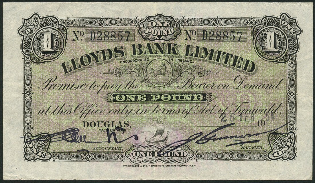 Lloyds Bank Limited, £1, Douglas, 26 February 1954, serial number D 28857, black, green and lilac, arms at centre, longship below, two manuscript signatures of Greenwood and Collister, reverse pale blue and pink, triskeles at centre, value at left and right