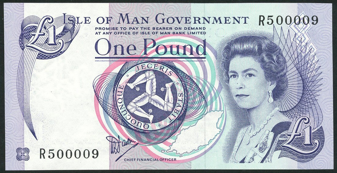 Isle of Man Government, £1, ND (1990), serial number R500009), multicolour, Queen Elizabeth II at right, Isle of Man Triune at centre, reverse Tynwald Hill and church, W Dawson signature, also 50p, ND (1979), blue on multicolour, Queen Elizabeth II at right, Isle of Man Triune at centre, reverse Viking ship