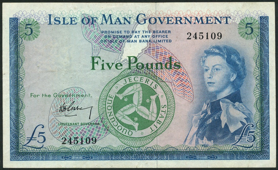 Isle of Man Government, £5, ND (1961), serial number 2455109, blue, green and multicoloured, Elizabeth II at right, triskeles at centre, Garvey signature at low left