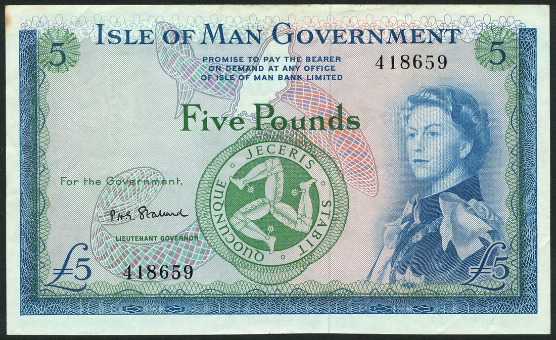 Isle of Man Government, £5, ND (1968), serial number 418659, blue, green and multicoloured, Elizabeth II at right, triskeles at centre, Stallard signature at low left
