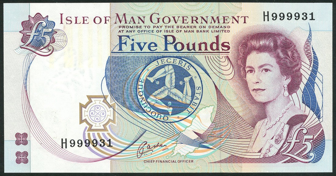 Isle of Man Government, £5 (3), ND (1991), serial numbers H999931-33, blue and maroon on multicoloured underprint, Elizabeth II at right, arms at centre, reverse Castle Rushen at centre, Cashen signature