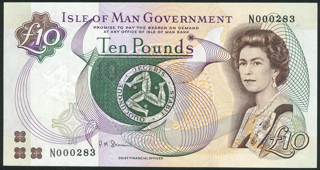 Isle of Man Government, £10 (3), ND (2002), serial numbers N000283-285, brown and violet on multicoloured underprint, Elizabeth II at right, arms at centre, reverse Peel Castle at centre, Shimmin signature