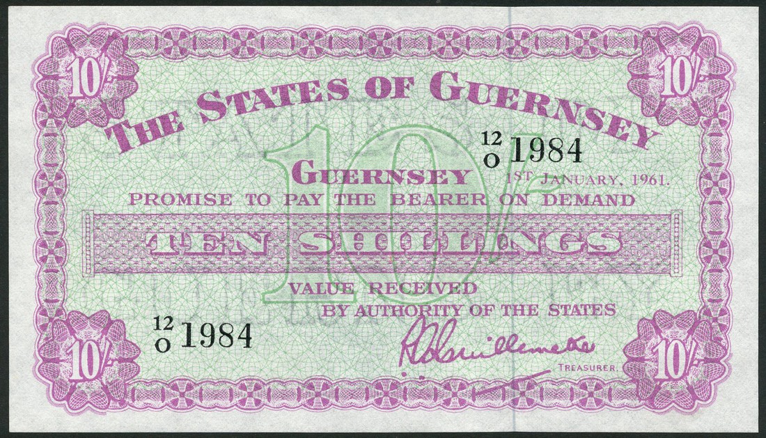 (x) States of Guernsey, 10/-, 1 January 1961, serial number 12/O 1984, pink and green, value at centre and each corner
