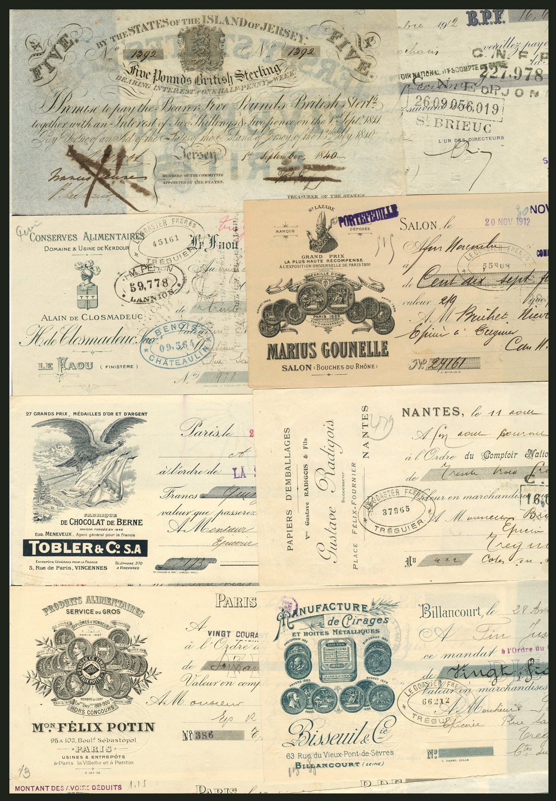 States of the Island of Jersey, interest bearing note, £5, 1 September 1840, serial number 1392, also a group of 11 French cheques with dates ranging from 1911 to 1913, of historical interest