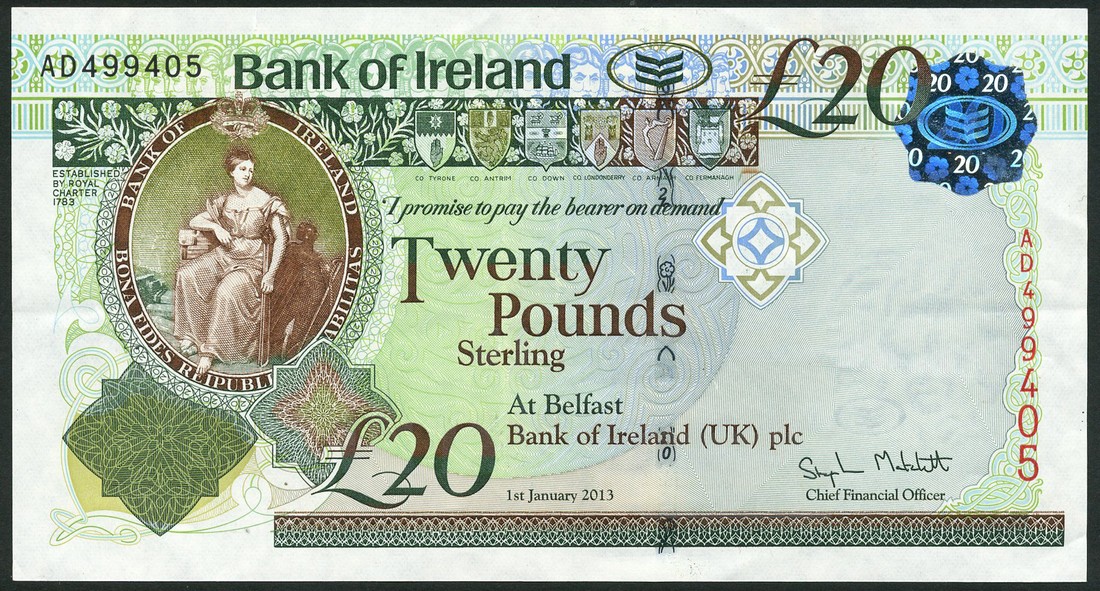 Bank of Ireland, £20 with printing error, 1 January 2013, serial number AD499405, brown and green, Hibernia at left, reverse printing completely missing except for underprint,