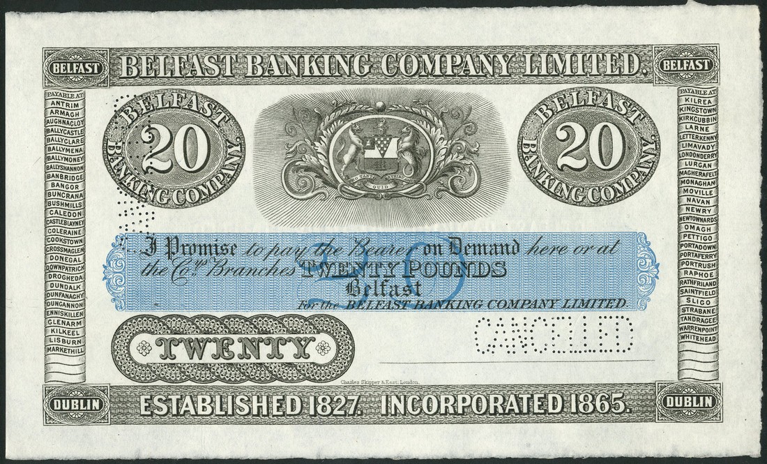 Belfast Banking Company Limited, Ireland, an unissued £20, Belfast, ND (ca 1918), black and white, value in pale blue underprint at centre, arms top centre flanked by value in oval frame top left and right, names of the branch offices (57) at left and right