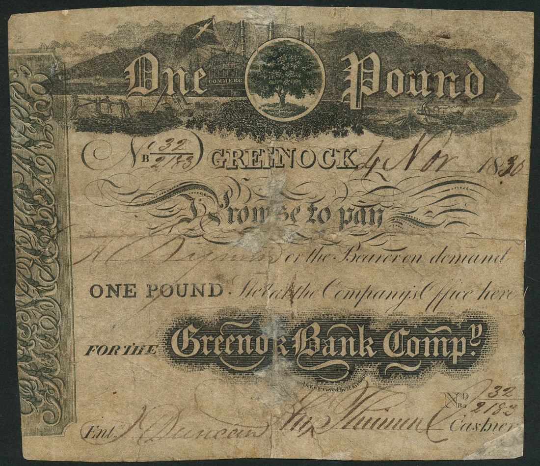 Greenock Bank Company, £1, 4 November 1836, serial number B 32/2183, black and white, Oak Tree and ship bearing the name Commerce, at centre