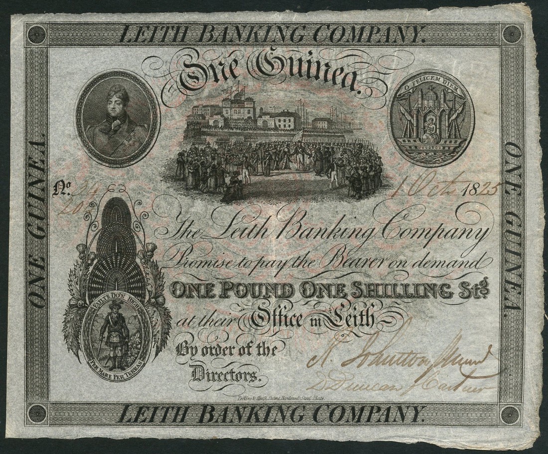 Leith Banking Company, 1 guinea, 1 October 1825, serial number 34/204, black and white, the arrival of George IV in Leith top centre, George IV top left, arms top right, Bonnie Prince Charlie low left, two manuscript signatures low right