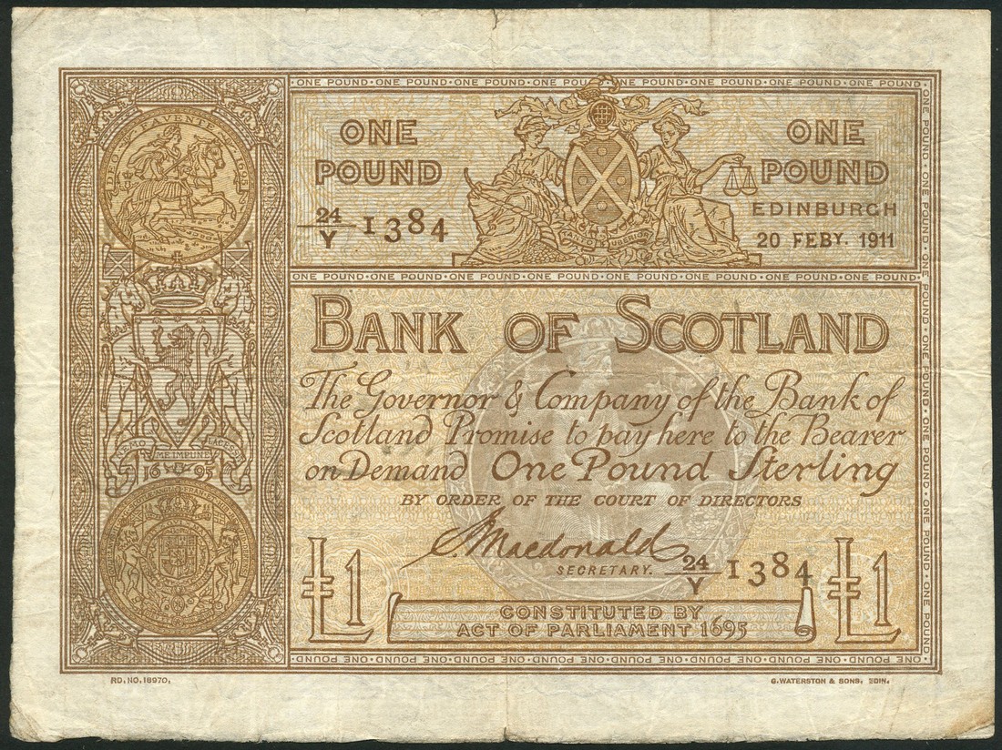 Bank of Scotland, £1, 20 February 1911, serial number 24/Y 1384, brown on grey and tan underprint, arms at top centre and centre left, coins at top end bottom left