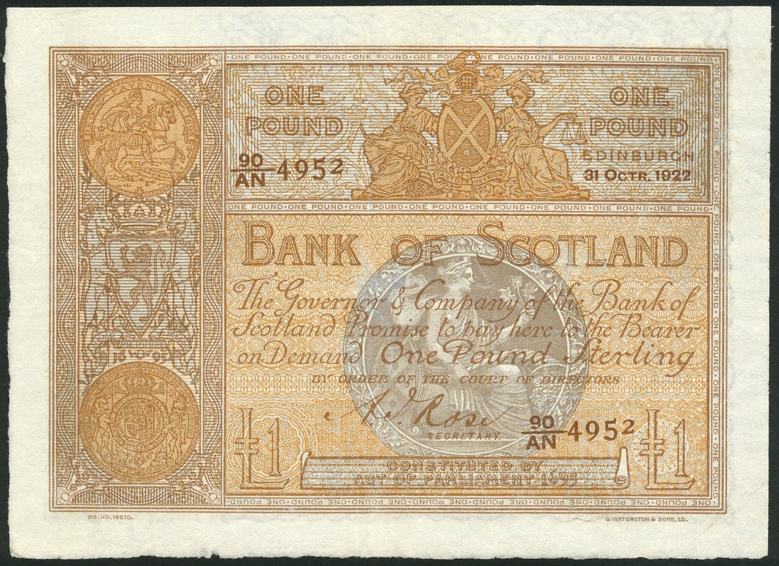 Bank of Scotland, £1, 31 October 1922, serial number 90/AN 4952, orange brown, Scotia in circular grey frame at centre, arms at left in vertical panel, arms top centre, Rose signature